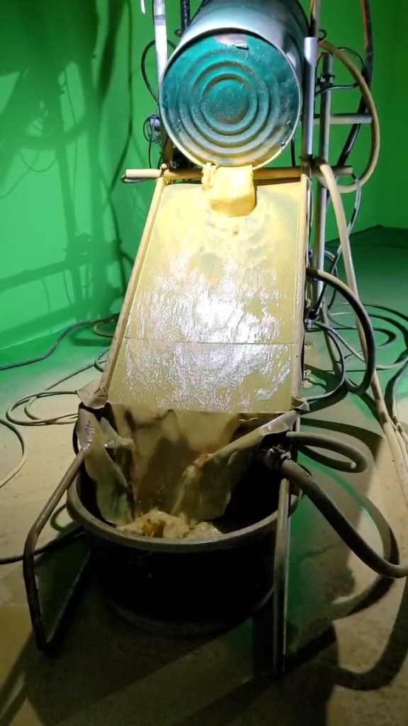 I ran to Muradiye Han to escape the rain. It was smaller than I had expected. This small space consisted of Anna Alenso’s sculptural machine, video, and sound installations. The main installation of the exhibition, which focused on the realities of gold mining in Venezuela, was designed as a sculpture converted from machines used in gold mining. The gold washing process was depicted by dirty water flowing on a noisy, sloping conveyor belt. A bulldozer cabin placed next to it seemed to make this space, which was small enough for two people to stand in, even more cramped.